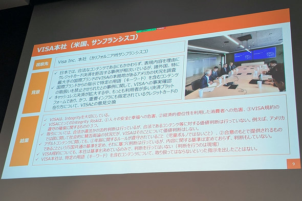 - 山田太郎参議院議員が渡米してVisaの米国本社において役員と対談し、Visaが特定のキーワードを指定してコンテンツの排除の指示を出したことはないとの確約を得る