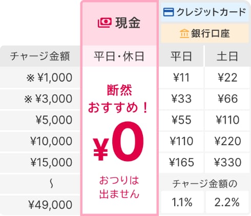 一方、クレジットカードや銀行口座の場合はアプリ上で完結するものの、例えば1万円をチャージすると平日110円、土日は220円の手数料がかかる。