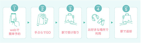 Webからの予約後、レンタル品を駅で受け取り、利用後は駅で返却する。レンタル品の受け渡し場所は、東京駅地下1階にあるサービスカウンター「BAGGAGE STORAGE +」もしくは1階の多機能ロッカー「マルチエキューブ」。対応時間はBAGGAGE STORAGE +が午前9時30分〜午後8時、マルチエキューブが東京駅の始発時刻〜終電時刻。なお予約時に受け渡し時間として指定できるのは、BAGGAGE STORAGE +が午後7時30分まで、マルチエキューブが午後11時まで。