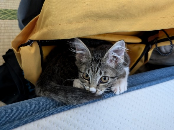 一方生成にFireflyが関与していない画像から動画生成させると、かなり予想外の結果が起こる。次の動画は以下の写真を元に、「子猫がカバンから這い出してくる」というプロンプトで生成されたものだが、こうした非現実な壊れ方をするのが、ある意味AIらしいと言えばAIらしい。