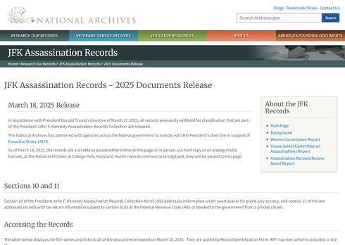 米トランプ政権は3月18日(現地時間)、ジョン・F・ケネディ大統領暗殺事件に関する資料「JFK Assassination Records」を公開した。同日午後10時半時点では全6万3400ページに及ぶデータ(PDF2182件)を米国国立公文書記録管理局の公式Webサイト上で掲載済み。トランプ大統領は「公開する文書は約8万ページに及ぶ」と説明していた。