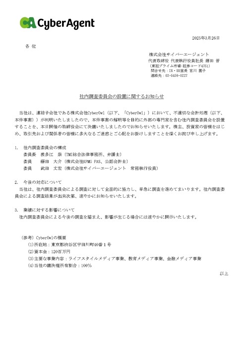 サイバーエージェントは「社内調査委員会による調査に対して全面的に協力し、早急に調査を進める。社内調査委員会による調査結果が出来次第、速やかに公表する」と説明している。「株主、投資家の皆さまをはじめ、取引先および関係者の皆さまに多大なるご迷惑とご心配をお掛けしますことを深くおわび申し上げます」(同社)