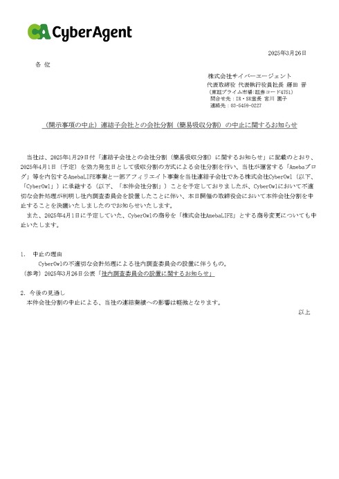 CyberOwlは、塾情報サービス「Ameba塾探し」などのメディア事業を手掛ける会社で、2012年に設立。代表取締役には、サイバーエージェント出身の田中啓太氏が就いている。本来であれば4月1日付で、「Amebaブログ」などの事業や一部アフィリエイト事業を吸収分割によってCyberOwlに承継する予定だったが、今回の事案を受け中止となった。