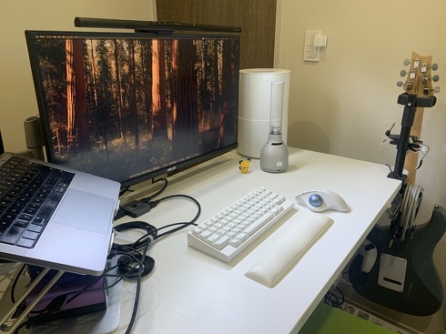 キーボードはHHKB2台をメインで使用していますが、新たに40%分割キーボードにも挑戦しており、いつでも練習できるように置いています。 旅行先で家族で作った思い出のキユーピー人形たちも見守ってくれています。