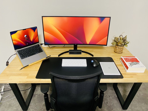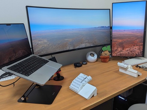 普段は開発をしたり技術調査をしてドキュメントを書くことが多いので、広い画面で作業をするために曲面ウルトラワイドモニターを使用しています。また、静かな環境で採用面談や会議に参加することがあるため、作業に集中できるよう防音室にデスクを設置してノイズを防止しています。デスクに関しては技術書や電子ノートなどを余裕をもって置きたいので、広めの天板(160x80cm)のデスクを使っています。