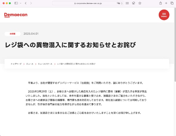 出前館は4月1日、商品を入れたレジ袋内にネズミが混入する事案が発生したとして謝罪した。配達員に商品の確認を徹底させるとしている。