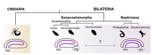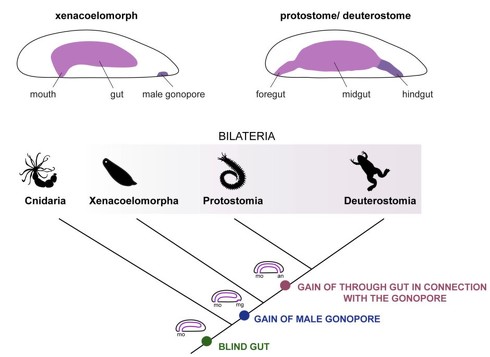 動物の消化管の進化を示す系統樹 刺胞動物門(CNIDARIA)は口(mo)のみを持つ盲腸型消化管を持つ 側系統群の左右相称動物(BILATERIA)は、さらに珍無腸動物門(Xenacoelomorpha)と腎動物(Nephrozoa)に分かれる研究では、肛門の発生に関わる遺伝子が、珍無腸動物門の雄性生殖口の周囲で発現していることを発見。これらの遺伝子は通常、左右相称動物の後腸と肛門の形成に関与している。この発見は、珍無腸動物門の雄性生殖口と左右相称動物の肛門が進化的に同じ起源を持つ(相同である)ことを強く示唆している。