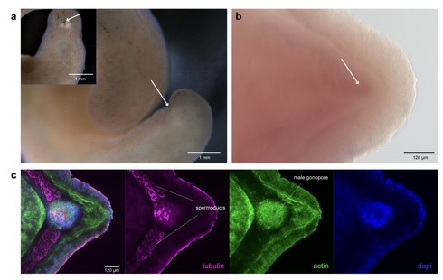 Source and Image Credits: Carmen Andrikou, Kevin Pang, Aina Borve, Tsai-Ming Lu, Andreas Hejnol. The xenacoelomorph gonopore is homologous to the bilaterian anus. bioRxiv 2025.02.10.637358; doi: https://doi.org/10.1101/2025.02.10.637358