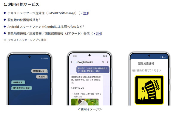 テキストメッセージのやりとり(AndroidはSMS/RCS、iPhoneはSMS/iMessage)の他、テキストメッセージを通じた現在地の位置情報共有、緊急地震速報、津波警報/国民保護情報(Jアラート)受信ができる。