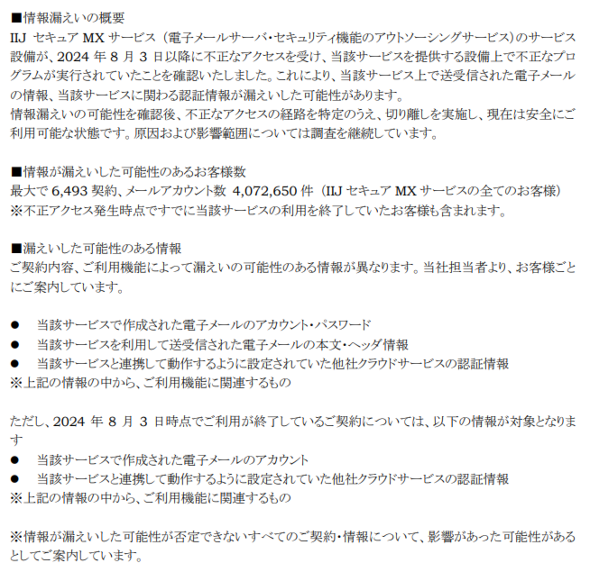 IIJは15日、24年8月3日以降に不正アクセスを受け、全ユーザー(契約数で6493件、メールアカウント数で407万2650件)の情報が漏えいした可能性があると発表した。原因や具体的な影響範囲は調査中としている。