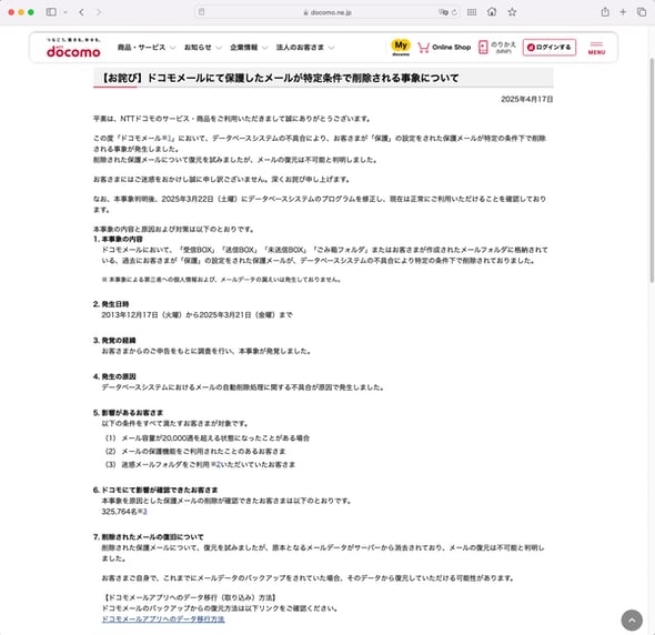 NTTドコモは4月17日、「ドコモメール」でデータベースシステムに不備があり、ユーザーが「保護」設定したメールの一部が特定の条件下で削除される不具合が発生していたと発表した。メールの復元を試みたが、不可能だったという。