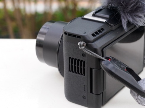 このPowershot V1。コンパクトだけどいざ構えてみると、ちょっと分厚いと感じる。よく見ると、上面と左側面にスリットが。実はここ、排熱用。中に冷却ファンが入っており、長時間の録画などで温度が上昇するとファンが回るのだ。