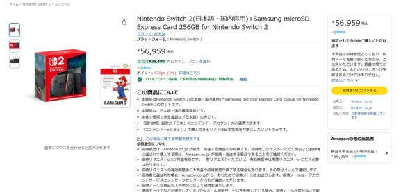 アマゾンジャパンは4月24日に、次世代ゲーム機「Nintendo Switch 2」の“招待制販売”を始めた。招待制販売では、商品ページにあるリクエストボタンを押すことで購入の申し込みが可能。申請したユーザーには、入荷状況に応じて抽選で購入リンク付きのメールが届く。申し込みは1回につき3カ月間有効。購入リンクの有効期間は48時間。
