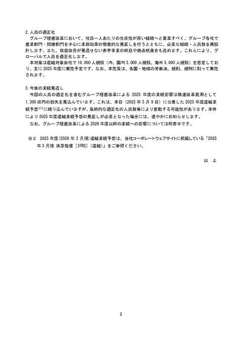 今回の人員整理は、同社の生産性を向上させるための施策の一環。グループ各社の営業部門・間接部門を中心に業務効率の徹底的に見直す他、必要な組織・人員数を再設計する。また、収益改善が見通せない赤字事業の終息や拠点統廃合も進める。