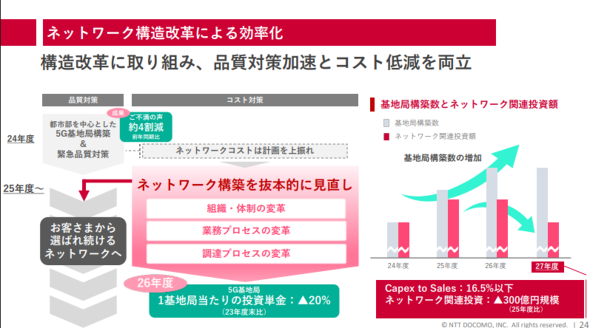 あわせて、ネットワーク構築の抜本的な見直しを進める。組織体制・業務プロセス・調達プロセスの改革により、2026年度には基地局1局あたりの投資単価を20%削減、2027年度にはネットワーク関連投資を300億円規模で圧縮することを目指す。売り上げに対する投資比率(Capex to Sales)の目標は「16.5%以下」を掲げた。