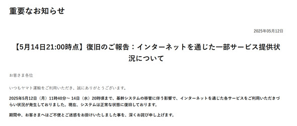 ヤマト運輸は、基幹システムの移管に伴って発生していた障害が5月14日午後9時に復旧したと発表した。発生から2日と8時間を経て復旧したことになる。