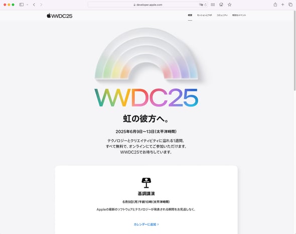 米Appleは5月20日、年次開発者会議「WWDC(Worldwide Developers Conference)25」の概要を発表した。iOS19などの登場が期待される基調講演は、現地時間の6月9日午前10時から。日本時間では6月10日午前2時からとなっている。