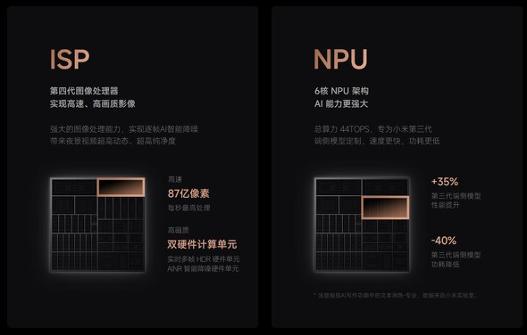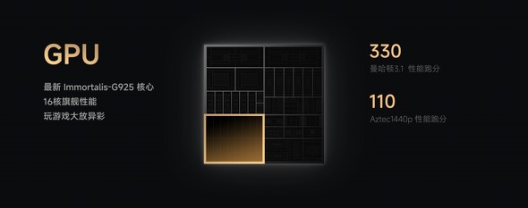 GPU部分には16コアのArm製Immortalis-G925を採用する。AI処理専用の6コアNPUは44TOPSの演算性能を提供し、AIライティングや意味検索、通知要約などの機能を支える。さらに同社の第4世代ISPを統合し、リアルタイムHDRとAIノイズリダクション機能を備える。