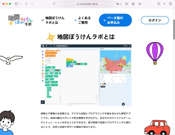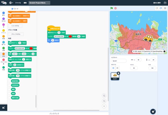 デジタル地図とプログラミングツールの「Scratch」を組み合わせた。直感的な操作でプログラミングを行い、町の観光ルートや防災シミュレーション、宝探しゲームなどを作成できる。ジオロニアは「遊び感覚で地図やプログラミングに触れることで、自然と地域や学びへの興味が深まる」としている。