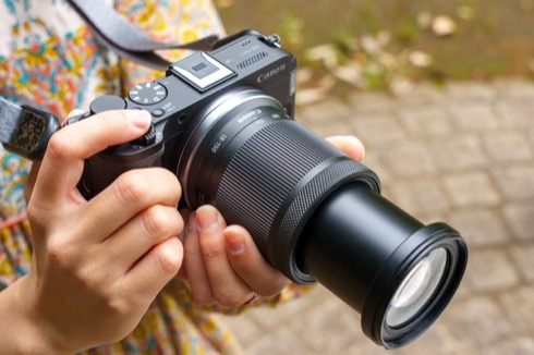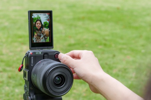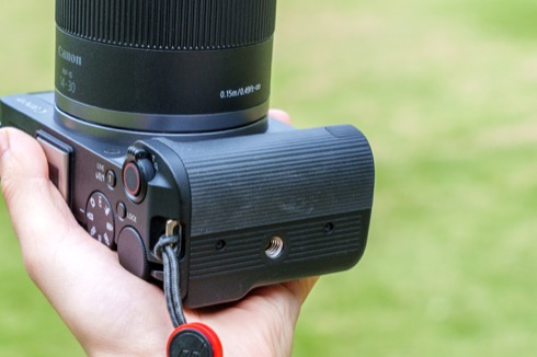 EOS R50Vは縦位置動画用にグリップ部に三脚穴があいており、三脚に据え付けるとこのように簡単に縦位置動画を撮れる。