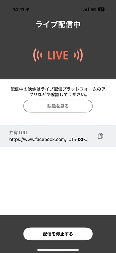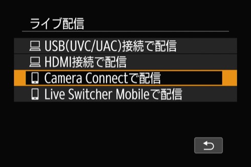 EOS R50 Vはライブ配信にも力を入れており、ライブボタンを押すとライブ配信メニューが開く。