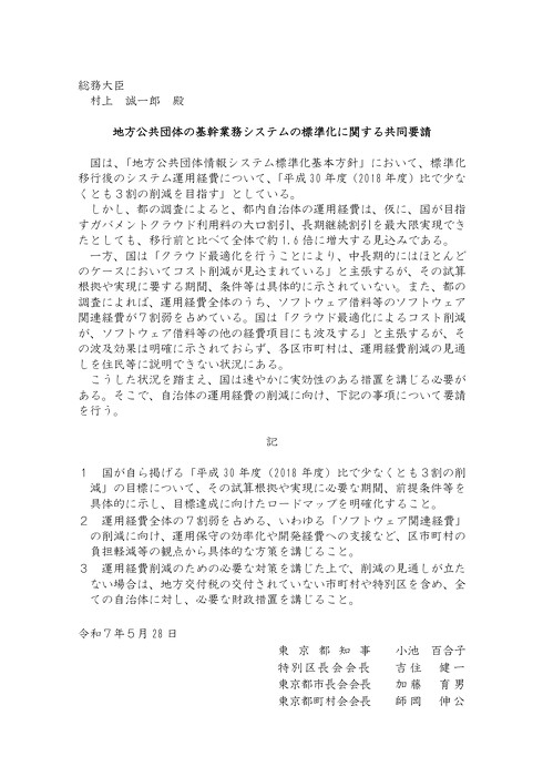 地方公共団体の基幹業務システムの標準化への要望はこれまで、都以外にも中核市市長会や指定都市市長会も声明を発表していた。その内容は都と同様に、経費負担が増加する見込みであるため、国に対して適切な財政措置を求めるものだった。