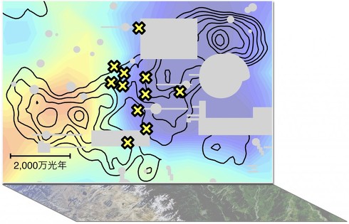 黄色のX印はクエーサーの位置、黒の等高線は銀河の密度 背景の色は中性水素ガスの密度を表し、赤いほど密度が高く、青いほど密度が低い(電離ガスが豊富) 左側の銀河集団には中性ガスが、右側の銀河集団のまわりには電離ガスが集中しているリャン博士は「われわれは、クエーサーが宇宙の状態が変わる“縁”に沿って分布していることに気付いた。これは、クエーサーが放つ強い光が周囲のガスの状態を変えていると同時に、作られつつある巨大構造、例えば銀河団の種をトレースしている可能性を示している」と解説。研究チームはこの構造を、2つの大陸が衝突してできたヒマラヤ山脈になぞらえて「宇宙のヒマラヤ」と呼称している。