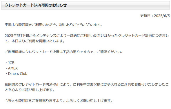 駿河屋は「長期間のクレジットカード決済停止により、ご利用中のお客さまには多大なるご迷惑をお掛けいたしましたことを心よりおわび申し上げます」としている。