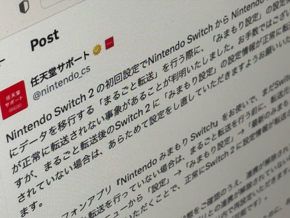 任天堂サポートのXアカウントは6月5日、同日発売した新型ゲーム機「Nintendo Switch 2」について、Switchからのデータ移行に使う「まるごと転送」機能で「みまもり設定」の設定情報が正常に転送されないケースがあると明らかにした。すでにまるごと転送している場合、手作業で設定し直す必要がある。