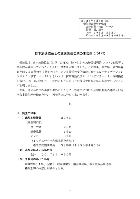 愛知県は6月6日、県が管理する一部のテレビ放送受信機器において、NHKとの放送受信契約が未契約だったと発表した。対象機器は計226台で、最長の未契約期間は1993年4月からの約32年間。未払い金額は2071万9630円で、速やかに支払い手続きを進めるとしている。