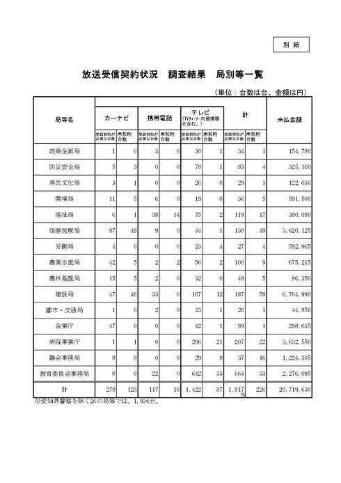 愛知県は、他県の自治体が管理するカーナビを搭載した公用車において、放送受信契約の未契約が判明したことを受け調査を実施。結果、愛知県が管理するカーナビ123台と携帯電話16台、テレビ(テレビチューナー内蔵機器を含む)87台、計226台の機器について、未契約のまま利用していたことが分かった。