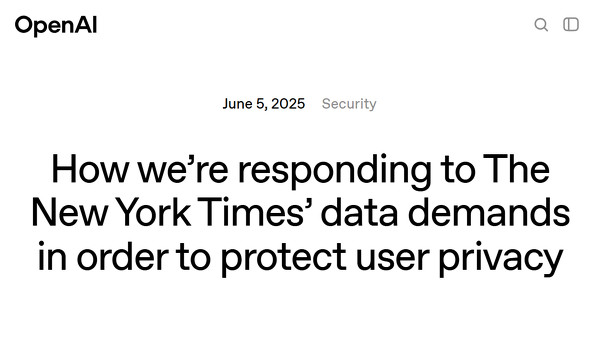 米OpenAIは6月5日(現地時間)、米The New York Timesによる著作権訴訟で、ユーザーが削除したChatGPTとの会話期限に」保存するよう裁判所から命令されたと発表した。同社は控訴するとしている。