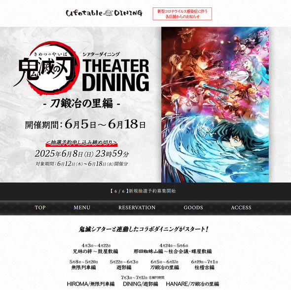 ufotable Ticketは、「ufotable DINING - 東京」「ufotable DINING -HIROMA-」「ufotable MOCKTAIL BAR GINZA」(それぞれ都内)の抽選予約ができるサービス。