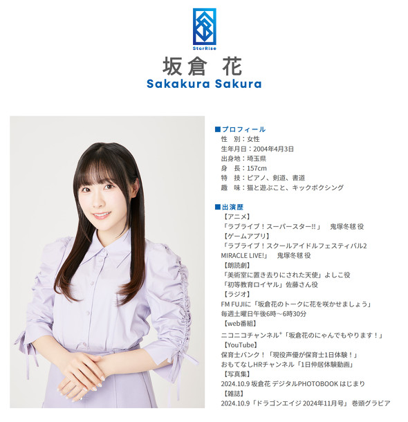 バンダイナムコグループのマネジメント事務所StarRiseは6月10日、所属声優・坂倉花(さかくら・さくら)さん(21)について、「極度の不安による体調不良が続いている」のため「医師の診断により当面の間すべての活動を休止し、休養に専念させる」と発表した。