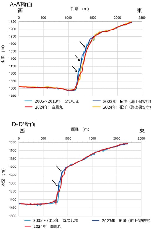 一方、崩落した物質の堆積(地形が高くなる)は認められなかった。JAMSTECは、崩落した物質の量が少なかったか、海底谷に沿った流れにより下流に流された可能性が考えられるとしている。