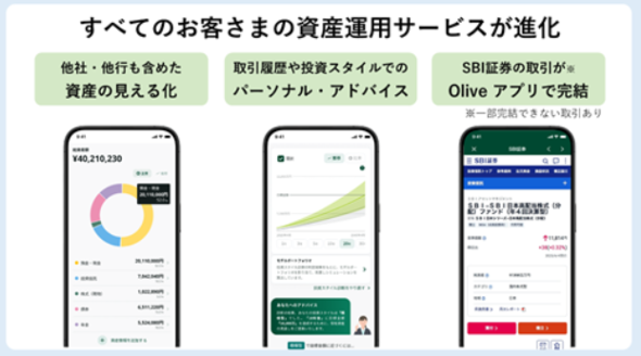 Olive Infinite以外のユーザー向けにも、SBI証券の取引をアプリ内で完結できる機能や、マネーフォワードとの連携による資産の「見える化」などを順次展開するという。