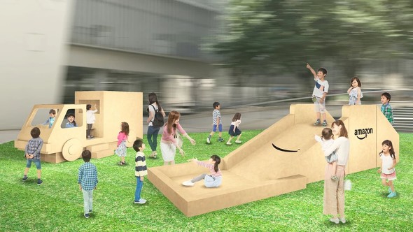 子連れの来場者向けに、段ボール遊具を設置。Amazonのスマイルマークの中にボールを入れて遊べるボールプール、スマイルマーク付きのすべり台を用意する。