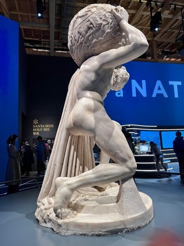 筆者としては、未来よりも「過去」に興味対象が向いたということもあります。なかでも、イタリアパビリオンの国宝級展示で満足度が爆上がりでした。2世紀に作られた大理石の彫刻像「ファルネーゼのアトラス」、レオナルド・ダ・ヴィンチの直筆スケッチ、バチカンパビリオン(イタリア館内)の「キリストの埋葬」は、その存在自身が解き放つオーラやエネルギーがその場の空気を支配しており、圧倒されると同時に見応え十分でした。
