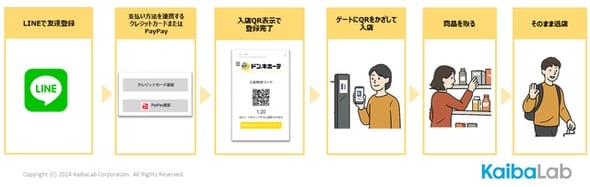 利用者は、LINEミニアプリに表示されるQRコードをかざして入店し、商品を手に取って退店するだけ。店内のAIカメラや各棚板に設けられた重量センサーで手に取られた商品を判別し、あらかじめ連携したクレジットカードまたはPayPayで決済される。レシートはLINEミニアプリ内で確認できる。