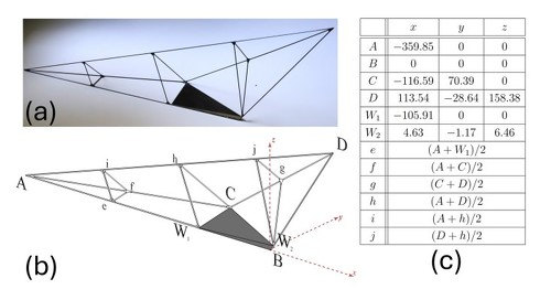計算によれば、四面体の軽い部分と重い部分の密度比を1000倍以上にする必要があった。この条件を満たすため、骨組みには外径1mm、内径0.5mmの炭素繊維チューブ(密度1.36g/立方センチ)を使用し、重りには密度14.15g/立方センチのタングステンカーバイドを採用。これは鉛よりもはるかに密度の高い材料だ。辺の接合部は密度1.3g/立方センチのエポキシ接着剤で接合している。