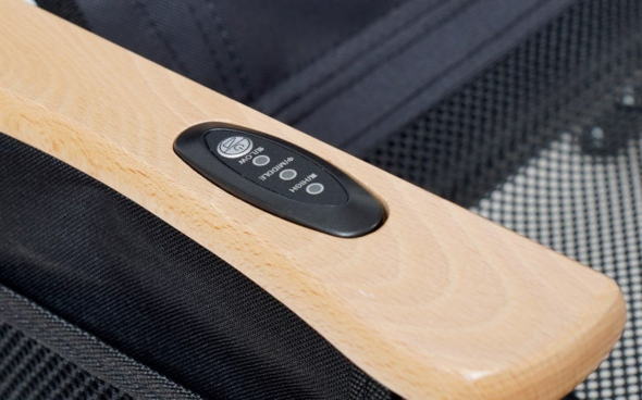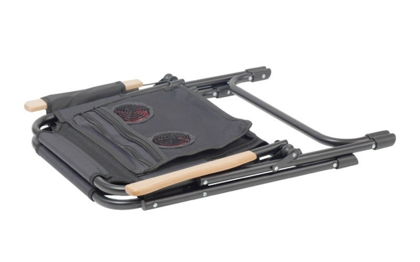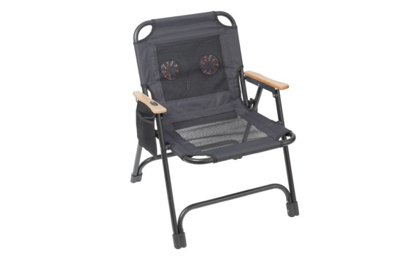 メッシュ素材の折りたたみ式アウトドアチェア。専用ポケットに手持ちのモバイルバッテリーを収納し、ファンを稼働させられる。ファンの風量は低・中・高の3段階で調整できる。操作ボタンは肘掛けに埋め込んだ。