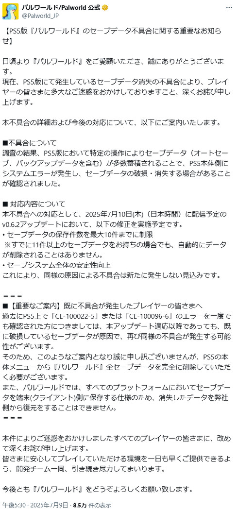 一方、過去にPS5でエラーコード「CE-100022-5」か「CE-100096-6」が発生しているプレイヤーには、10日のアップデート適応後にも同様の不具合が発生する可能性があると案内。同社は「PS5の本体メニューから『パルワールド』全セーブデータを完全に削除する必要がある」と説明。消失したデータの復旧は、ポケットペアにもできないという。