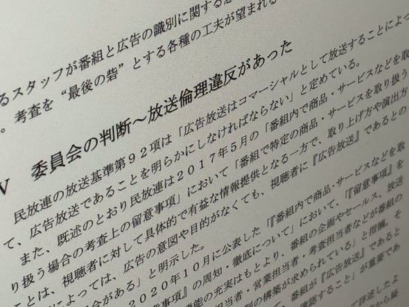 放送倫理・番組向上機構(BPO)は7月11日、TBSテレビ(東京都港区)が2024年10月19日に放送したバラエティー番組「熱狂マニアさん!」2時間スペシャルに「放送倫理違反があった」とする意見書を公開した。同番組では、家具大手のニトリを全編で紹介し、CMも同社提供。視聴者から「これは番組といいながら、明らかに広告ではないのか」と指摘を受けていた。