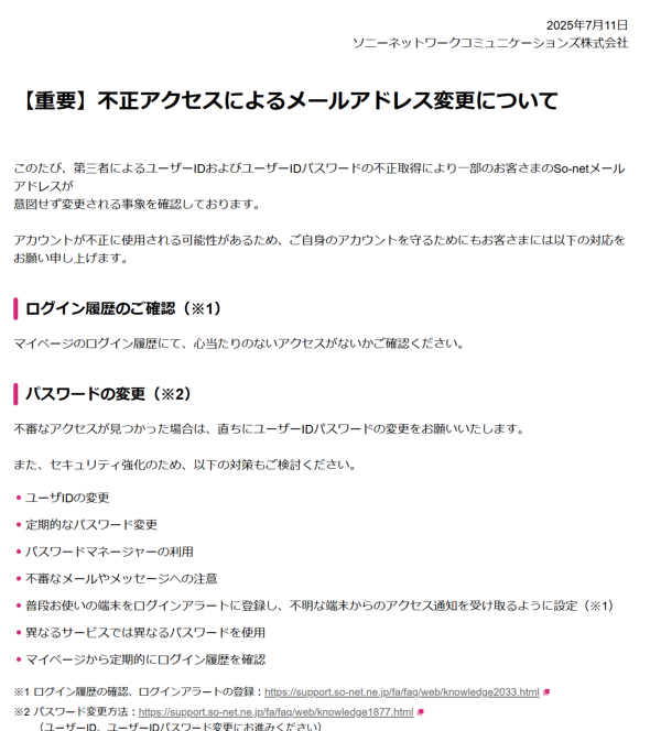 ソニーネットワークコミュニケーションズは7月11日、So-netユーザーのID・パスワードが第三者に不正取得され、一部ユーザーのSo-netメールアドレスが意図せず変更されたと発表した。