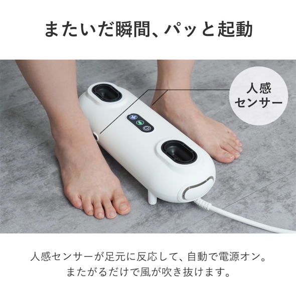 またがると人感センサーが感知し、前後2つの吹き出し口から最大風速15m/秒の風が吹き抜けて身体の前後を同時に冷やす。送風・温風・熱風の3段階で温度を調節でき、風量は弱・中・強の3段階から選べる。