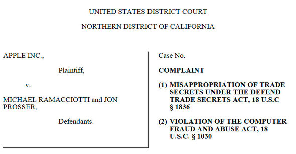 Lipnik氏のiPhoneには「まだ公開されていないAppleの重要な営業秘密情報が大量に含まれている」とし、AppleはProsser氏とRamacciotti氏がどの程度の情報を保有しているか不明だと述べている他、営業秘密を保護するため、Appleは同社の機密情報のさらなる開示を禁止する差し止め命令を求める訴訟を提起し、その不正使用に対する損害賠償を求めている。