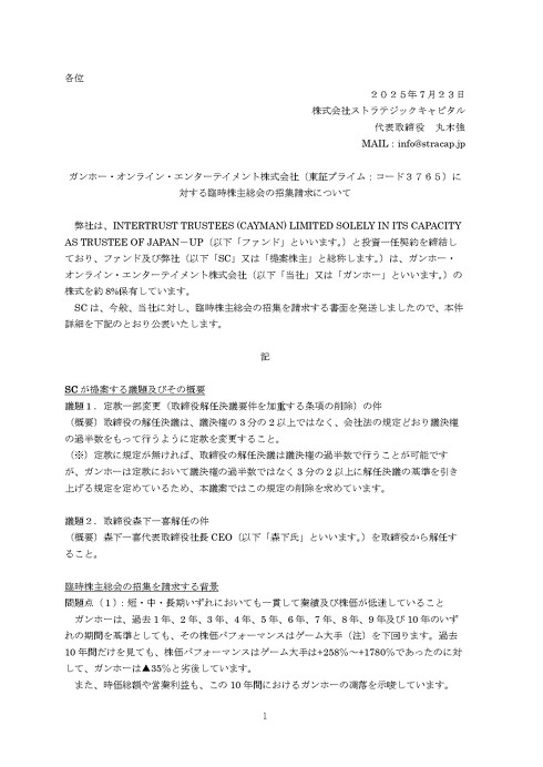 ガンホーを“一発屋”にした責任ある──投資ファンドのINTERTRUST TRUSTEES(CAYMAN) LIMITED SOLELY IN ITS CAPACITY AS TRUSTEE OF JAPAN−UPとストラテジックキャピタルは7月23日、出資先であるガンホー・オンライン・エンターテイメントに対して、臨時株主総会の招集請求を行った。その議題として、ガンホー・森下一喜CEOの取締役の解任などを提案している。