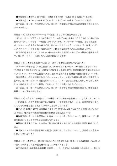 また、ストラテジックキャピタルは「ガンホーは『パズドラ』を2012年にリリースしてから13年にわたり次のヒット作を出せていない、いわゆる『一発屋』となっている」と続ける。これについても「森下氏が、他のゲームクリエイターではない『一発屋』のゲームクリエイター、つまり森下氏自らにゲーム開発の全権を与えたことに起因」すると指摘し、その責任を取るように求めている。