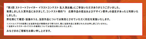 審査期間をへて、カプコンは22日に入賞作品を発表。特設サイトに掲載した他、26作品の人気投票を開始していた。しかし、25日には「発表した入賞作品において、コンテスト規約『5 応募作品の提出およびデザイン要件』の違反があったと判断した」と声明を出し、該当作品の入賞は無効にすると発表した。