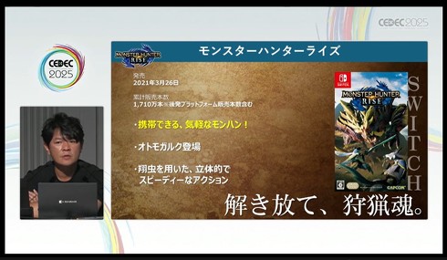 その後、2021年3月26日には「モンスターハンターライズ」(Nintendo Switch他)を発売。辻本プロデューサーは「モンハンシリーズが広まったきっかけにもなった、携帯機でも遊べる作品をどうしても提供したくなった」と企画経緯を説明。アクション面でもより立体的でスピーディーなものを目指した。